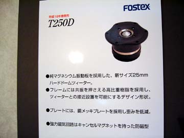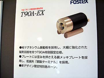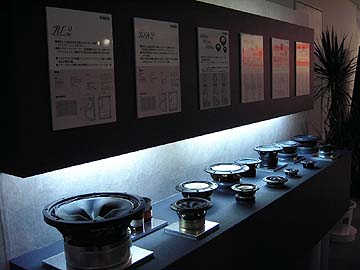 | そう、ここはFOSTEXのブース。目に飛び込んできたのは同社の新製品ユニットたち。なんと重厚なスーパーツイーターなのだろう!そして、うわさのマグネシウム振動板フルレンジユニットもついにお目見え! | ||||||||||||||||||||||||||||||||||||||||||||||||||||||||||||||||