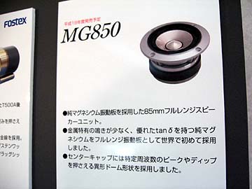 | こちらは8.5cm純マグネシウム振動板フルレンジユニットMG850。限定スピーカーユニットだ。このユニットのフレームはFE88ES-Rのフレームと同じもの。フレームは銀色に塗られており、振動板との色彩的マッチングを図っている。個人的には、フレームは黒でよかったような気もする。来年発売ということだけが決まっているのだが、発売月などはまだ未定とのこと。価格について尋ねてみたが、まだ未定との事。ただ、8.5cmという小口径ユニットであることから、極端な高値にはできないだろうとのこと。2万は下回るようだ。たぶん、FE88ES-Rより若干高いくらいではないか。振動板は兼ねてよりうわさされていたマグネシウム振動板だ。開発には相当の苦労があったと聞いており、ひょっとしたら計画中止か?とまで囁かれていたユニットだ。それを今、この目で眺めることができるとは、なんという幸せ。マグネシウム振動板というのも、最近の流行のようなところがある。同フェスタには日本金属株式会社もマグネシウム振動板を引っさげてブース展示を行っている。なお、フォステクスが今回開発したマグネシウム振動板は、日本金属株式会社とは無関係らしい。 | ||||||||||||||||||||||||||||||||||||||||||||||||||||||||||||||||