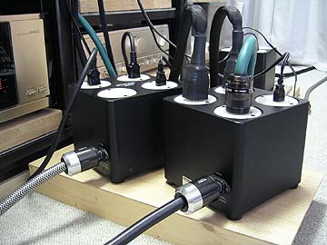 | 壁コンセントからの電源ケーブルがエソテリックの8N-PC8100/8N-PC8000に!8N銅を用いた同ブランドの初にしていきなりハイエンドな電源ケーブルである。この2種類の電源ケーブル、いずれも各250本限定販売で、市場にはもうほとんど残っていないはずだ。左が8N-PC-8100で、定価315,000円。アンプ系への電源ボックスに繋がっている。右が8N-PC-8000で、定価210,000円だった。こちらはソース機器への電源供給電源ボックスに繋がれている。オヤイデ電気との共同開発なる、このプラグ/コネクター、うーん機能美だ。 | ||||||||||||||||||||||||||||||||||||||||||||||||||||||||||||||||