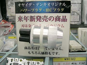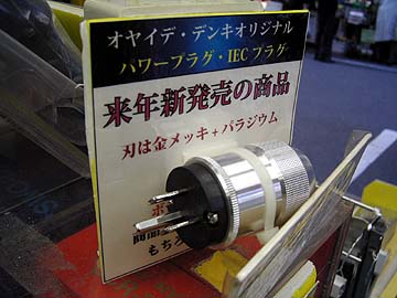 | さて、オヤイデ電気の最新状況はというと、凄いものが展示されとりました!来年発売予定の新型電源プラグとIECインレットコネクターっす。アルミケースに包まれた、なんとも重厚感漂うデザインにただただ唖然とするばかり。電極自体はC-046/P-046と同等のようだが、よくよく観察してみると、微妙に形状が違うところもあり、完全に同じというわけでもなさそうだ。それにしても、オール金属製ケース採用の電源プラグとは、これまた国産初ではないか。海外製でいうと、Zucableの完成品ケーブルにアルミケースを装着したものがあったが。いけいけどんどんオヤイデ電気!こんなに新製品を連発して採算に合うのか心配になるのだが、村山社長さんの開発意欲には恐れ入るなぁ。このプラグとコネクター、一体いくらになるのだろうか?個人的には、実売9,000円くらいかなと想像してみたりする。 | ||||||||||||||||||||||||||||||||||||||||||||||||||||||||||||||||