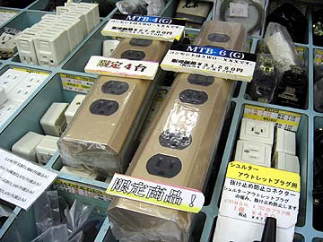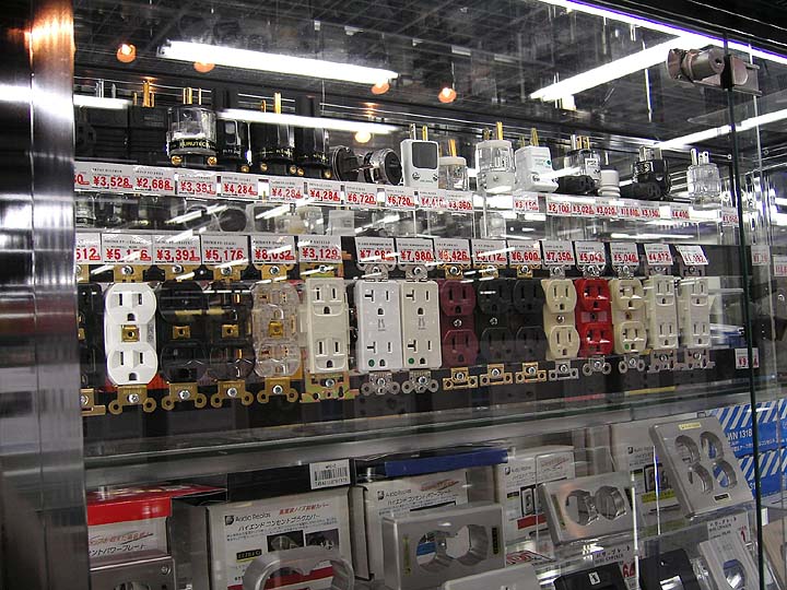 | コンセントとACプラグ、IECコネクターの展示。あまりにマイナーなものを除き、国産ブランドはほぼ揃っている。海外ブランドはハッベルとPSオーディオ。レビトンは置いていない。つまりは、PSE認証を受けた製品のみの取り扱いだ。大型店ゆえ、危ない橋は渡れないのだろう。販売価格は割高だ。ただし、ヨドバシは通常、購入金額に対し10%のポイント還元が付く。これを鑑みると、キムラ無線などの専門店と価格的にほぼ拮抗する。 | ||||||||||||||||||||||||||||||||||||||||||||||||||||||||||||||||