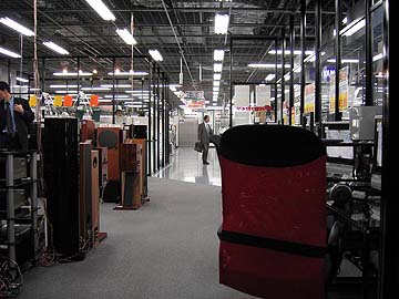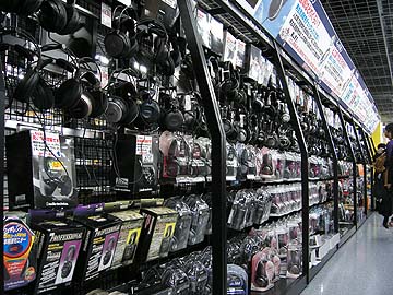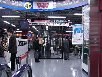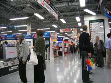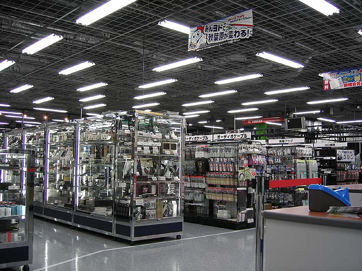 | 音と映像のフロアという名称の通り、ここ4階にはオーディオ機器/オーディオアクセサリー/テレビ/AV収納ラック/ビデオカメラなどが売られている。左写真をご覧いただいてもお分かりいただけると思うが、フロアの先から先までは相当に長い。とにかく広いのだ。ざっと見で、テレビなどの映像関係が5割、オーディオ関連が2割、その他AV小物が3割といった面積配分。 | ||||||||||||||||||||||||||||||||||||||||||||||||||||||||||||||||