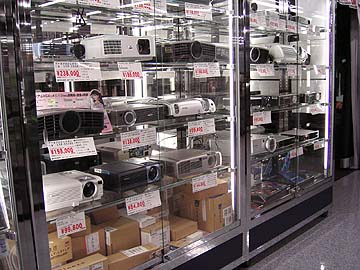 | プロジェクターの品揃えも充実している。このショーケースの右端には広めの投影室が設けられており、常時10台ほどのプロジェクターが映像投影している。しかも、各機が同じ壁面側に映像投影しているので、瞬時に各機の画質の比較ができるようになっている。品揃えはもとより、視聴環境の充実ぶりに関しても、AV専門店を凌駕しているかもしれない。右上は、ヘッドホンの展示エリア。商品数の多さに圧倒される。ヘッドホンの品揃え数に関しても、たぶん国内最大規模だと思う。そして、ほぼ全てのヘッドホンが常時試聴できる。ヘッドホンの試聴は、上写真のような大型ヘッドホンコーナーだけではなく、中型ヘッドホンのコーナー、小型ヘッドホンのコーナーなど数列にわたり設けられている。 | ||||||||||||||||||||||||||||||||||||||||||||||||||||||||||||||||