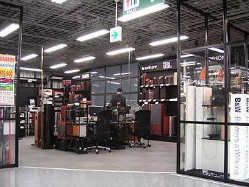 | オーディオフロアは、メーカー毎のオーディオコンポーネント展示エリア/オーディオアクセサリーとDJ関連エリア/スピーカー試聴室/プロジェクター視聴室/オーディオラックエリアに区分できる。同店の特徴は、メーカーブランド毎に展示コーナーを設けている事だ。映像関連でも同様の展示方法を採用している。オーディオエリアに関しては、各ブランド毎がガラスなどの間仕切りで仕切られている。パイオニア、マランツ、デノン、オンキョー、ボーズ、ヤマハなどが、独立したコーナーを設けているのだ。おおっぴらには撮影出来ないので、各メーカーの展示コーナーまで撮影する余裕はなかった。ま、興味のある人は、同店に直接足を運んでみてくだされ。この展示方法を目の当たりにして思うには、ブランドがごっちゃになっているよりか、ブランド毎にまとめて展示してくれた方が良いと思った。そのメーカーのコンセプトが明確に感じられ、好感度が持てるのだ。もっとも、こんな展示方法は、店舗フロア面積が広いとできないことである。 | ||||||||||||||||||||||||||||||||||||||||||||||||||||||||||||||||