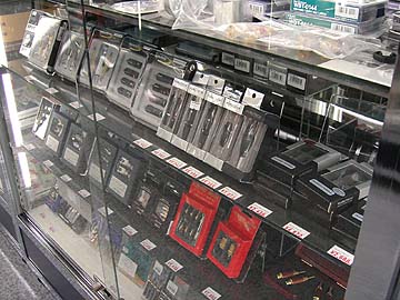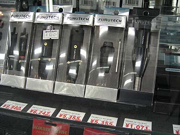 | RCAプラグ/キャノンプラグ/SPターミナルなどが納められているショーウインドウ。フルテック、AETを始め、かなり充実している。マイナーブランドやノーブランド品は置いていない。写真には写っていないが、WBTの端子類もかなり充実している。注目すべきはフルテックのキャノンプラグFP-701M。右上写真中の一番右端の\1,071と値付けされているプラグだ。これは発売されてから2年ほど経過しているのだが、店舗で実際に売られているのは初めて見た。FP-701Mを扱っている店は、行きつけのオーディオ店の中でもここだけだ。たぶん。 | ||||||||||||||||||||||||||||||||||||||||||||||||||||||||||||||||