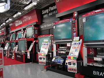 | こちらはフラットテレビの販売エリア。4階で最も賑やかなエリアだ。ここも各ブランド毎に区分けされている。思い切った展示方法だ。他メーカーと比較しずらいなどのデメリットもあるが、メーカーの特色を理解するという点では、このような展示の方が分りやすい。