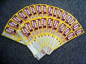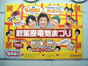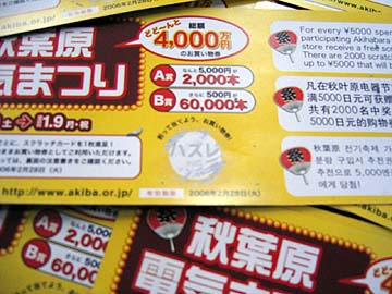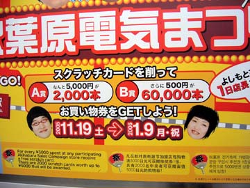 | 恒例の秋葉原電気まつりが開催中。2006年1月9日まで。今年は買い物5,000円毎にスクラッチカードをもらえる。当たりが出れば、5,000円か500円のお買い物券がもらえるというもの。秋葉原電気街振興会の加盟店での買い物が対象。知名度のある秋葉原家電店はみんな振興会に加入しているので、スクラッチカードがもらえる。ただ、ヨドバシカメラ秋葉原店は未加入なので、スクラッチカードはもらえない。 |