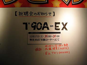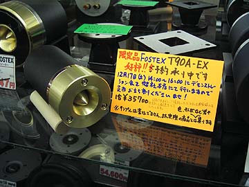 | FOSTEXの新型スーパーツイーターT90A-EXの試聴会が告知されていた。講師の方々はお馴染み。私も同機を予約しているし、佐藤さんや炭山さんによるマニアックトークも面白そうだ。これはぜひとも行かねばなるまいと誓いつつ、行きそびれてしまった。右はコイズミ無線本店ショーウインドウに陳列されているT90A-EXのサンプル展示。 | ||||||||||||||||||||||||||||||||||||||||||||||||||||||||||||||||