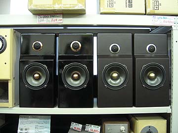 | さて、コイズミ無線の最新状況。左上はコイズミ無線マイウェイ店の店先。ラジオ会館脇にあるマイウェイ2というアーケード街の中程にある。このマイウェイ店の右側にあるエレベーターから5階まで上ると、コイズミ無線本店がある。 右上はコイズミ無線の中古ユニットコーナー。サワフジの平面フルレンジユニットが陳列されていた。これはすでに絶版になっている。懐かしいなぁ。このサワフジの平面ユニットを元にさらなる改良を加えたのが、ビクターダイレクトドライブ方式振動板である。 |