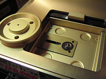 | ディスク設置スペースとスタビライザーも、外装と同じシャンパンゴールドで統一。トランスポーターなので、背面にはデジタル出力端子しかない。S/PDIF(RCAとTOS)、AES/EBU(XLR)の出力ポートが確認出来る。 | ||||||||||||||||||||||||||||||||||||||||||||||||||||||||||||||||