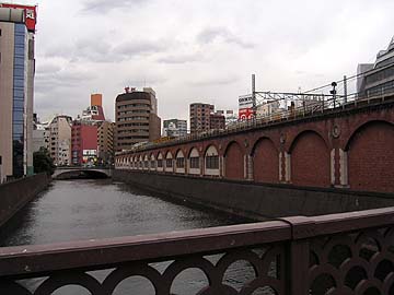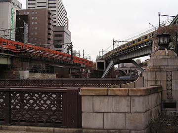 | こちらは秋葉原電気街の外れにある神田川。昌平橋より撮影。河の先に見える橋は万世橋。レンガ造りの建物は万世橋駅跡。戦前、万世橋駅は国鉄中央線の始発駅だった。現在は、この建物をかすめるように中央線が走っている。建物内は交通博物館になっている。秋葉原、知れば知るほど懐が深いのである。 右上は万世橋駅跡とは反対側の風景。中央線と総武線が立体交差している。私は普段、中央線を通勤に利用しているし、秋葉原からお茶の水へ抜けるにもこの昌平橋を通る。だから、この風景は見慣れているはずなのだが、こうやって改めて眺めると、味わい深いものがあるなぁ。 |