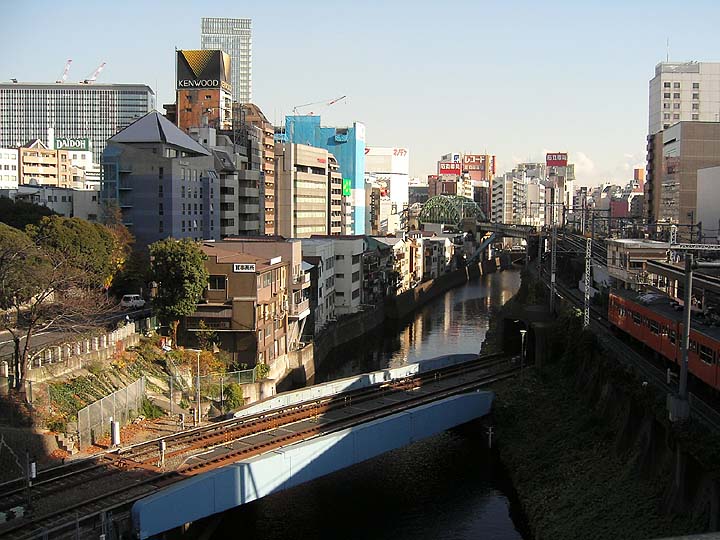 | さて、こちらはお茶の水の聖橋から秋葉原方面を眺めたところ。起伏のある町並みがなんとも美しい。神田川をまたいでいるのは東京メトロ丸ノ内線。丸ノ内線が地上に露出する数少ない地点だ。その先で河をまたいでいるのはJR総武線。中央線(オレンジ色の電車)は神田川をまたがずに、右方向(神田駅、東京駅方面)へ曲がっていく。奥の方には秋葉原の電気街が見える。お茶の水から秋葉原までは総武線で1駅。乗車時間はほんの1〜2分ほどだ。歩いても5分ほど。構内の移動時間と電車の待ち時間を考えると、お茶の水-秋葉原は歩いた方が早かったりする。 | ||||||||||||||||||||||||||||||||||||||||||||||||||||||||||||||||