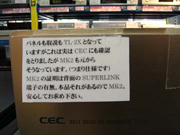 | こちらはオーディオユニオン吉祥寺店。CECのCDトランスポートTL-2X。横幅380mmと、通常サイズのコンポよりやや小さめ。シャンパンゴールドが美しい。手の届く位置に置いてあったので、蓋をスライドしてみた。蓋の開閉は手動。とても滑らかだ。ベルトドライブ方式かぁ。 | ||||||||||||||||||||||||||||||||||||||||||||||||||||||||||||||||