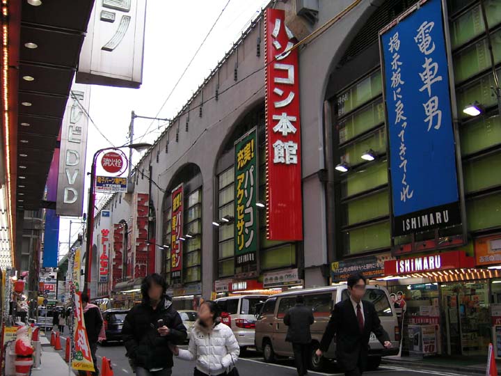 | 石丸電気本店の直下より中央通り方面を望む。建物の上には総武線が走っている。放送が終わって3ヶ月経つのだが、いまだに電車男の撮影で使われた看板が吊られている。 | ||||||||||||||||||||||||||||||||||||||||||||||||||||||||||||||||