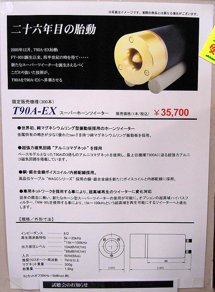 | 入り口にはFOSTEXのT90A-EX先行予約案内が告知されていた。ついに出たかという感じだ。T90A-EXは純マグネシウム振動板採用の限定ユニット。オーディオ雑誌各誌にも同様の広告が掲載されているので、ご存知の方も多いだろう。定価は35,700円/本。私はすでに1ペア予約した。 近年盛んなスーパーツイーターブームだが、これは注目株だ。高額な外来製品が目立つ中、T90A-EXの値付けはむしろ良心的と言えるかもしれない。そうは言っても、ペアで7万円。決して安い買い物ではないのだが、フォステクスファンとしては買わずにはいられない。限定生産のため、確実に入手するなら予約したほうが無難。発売開始は翌年1月頃になる模様。 |