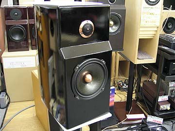 | コイズミ無線本店奥の試聴システム。手前の黒い2wayブックシェルフスピーカーはコイズミ無線オリジナルスピーカーだ。アルパインカーオーディオユニットシステムDLX-Z17PROをコイズミ無線オリジナルエンクロージュアKB20-DLXF1730に組み込んだのが、このスピーカー。コイズミ無線の自信作だ。価格は122,850円/ペア。ペア25セット限定。エンクロージュアの配色は黒と焦げ茶がある。 このユニットはアルパインのDDDLinearSuperHighComponentSpeakerと呼ばれる最上位シリーズの製品だ。アルパインと言えば、DDDS5やDDDS7などのロクハンユニットでお馴染みだった。非金属フレームに特殊な磁気回路を搭載した高性能ユニットとして人気を博した。今回のユニットにもその思想が反映されているようである。 KB20-DLXF1730は内容積20L、バスレフ型。流線型状なので、定在波が立ちにくい。また、ツイーター取り付け位置をずらす事で、リニアフェーズを実現している。 |