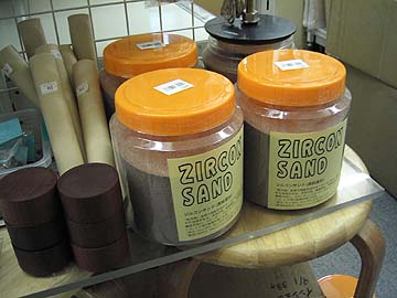 | ついでに、コイズミ無線の定番商品を紹介しておこう。こちらはジルコンサンド。オレンジ色をした蓋のボトルは5kg入りで1,848円。マニア御用達の防振素材だ。ジルコンサンドというのはオーストラリアの砂漠の砂。普通の川砂に比べ比重が高い。私が実測した限りでは比重2.7だった。ジルコンサンドはジルコン元素(Zr)が主構成成分。ZrO2が65%、SiO2が35%の割合。非常に細かい砂で、導通性もなく、磁性成分も少ない。本来は、工業用の研磨材の一種として使われているらしいのだが、オーディオの防振にも優れた効果を発揮する。 | ||||||||||||||||||||||||||||||||||||||||||||||||||||||||||||||||