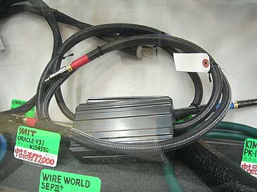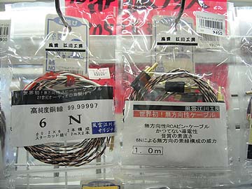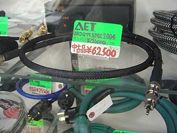 | こちらはテレオン第2店、テレオンサウンド110。ここの中古ケーブルコーナーは頻繁に出物が出現する。左上はAETのデジタルケーブルURDG75SPEC2004。定価1,260,000円が62,500円。うーん、欲しいっす。BNC/RCA切換え可能端子なのもありがたい。右はMITのORACLE-V31。定価284,550円が172,000円か。さすがはオラクルシリーズ。Zサーキットが異様にでかい。そうそう、MITの電源ケーブルはPSE認証取れたのだと思っていたのだが、同店の原さんによると、いまだ取得していないらしい。 非認証品の取り扱いを止めていたオーディオ各店も、正式施行から1年半を経た現在は軟化傾向にある。中古品においてではあるが。 |