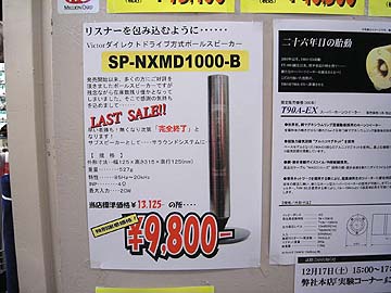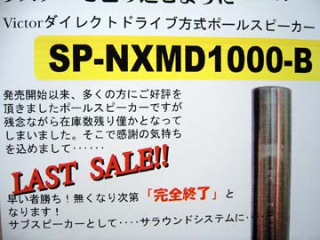 | SP-NXMD1000-Bの最終販売の案内。ラストセールという事で、9,800円/本のお値打ち特価になっていた。 SP-NXMD1000-Bはビクターのシステムコンポ付属スピーカー。マニア間で、煙突とあだ名されているスピーカーだ。ビクターダイレクトドライブ振動板を搭載。これはサワフジの平面ユニットを発展させたものだ。 SP-NXMD1000-Bはニアフィールドスピーカーとして突出した性能を有するという事で、江川三郎先生が高評価をされた。これと平行して、コイズミ無線やエンゼルポケットで単体販売を開始。 SP-NXMD1000-Bを元に様々なカスタマイズを施すのがマニア間で流行ったりもした。 このスピーカーに関しては、SP-NXMD1000-BのX処理バージョンも含め、幾度か試聴したことがある。私自身は、巷で騒がれているほど凄くはなかったが、悪くもなかった。小型ゆえ、低域が出にくいのは致し方ない。管弦楽などを小音量で聴きたい人には好適かもしれない。それと、ニアフィールドスピーカーとして、耳から近い位置に設置してやる方が良い。底面に据え付けられているネジ止め式スピーカーターミナルは安っぽいネジ止め方式。 |