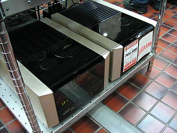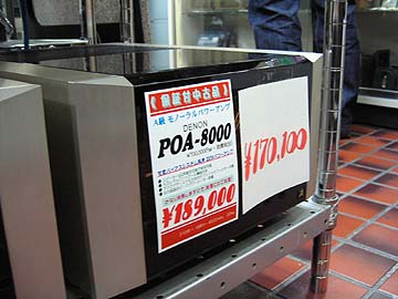 | こちらはダイナミックオーディオ秋葉原中古買い取りセンター。デンオンのモノラルパワーアンプPOA-8000が入荷。非常に洗練されたデザインで、これが1980年代の製品だとはとても思えない。内容はわからんが、外見的には現代でも十分通用するんじゃないかな。天板はスモークガラスか樹脂でできており、内部回路が透けて見える。とても珍しく、また、美しいアンプだ。外形寸法はW310 H188 D452。重量22kg/台。A級アンプだが、出力はなんと200W。発売当時の価格はペア700,000円。電源ケーブルは直出し。撮影したのは11月下旬だが、11月初旬にはPOA-8000は2セット、つまり計4台売られていた。 | ||||||||||||||||||||||||||||||||||||||||||||||||||||||||||||||||