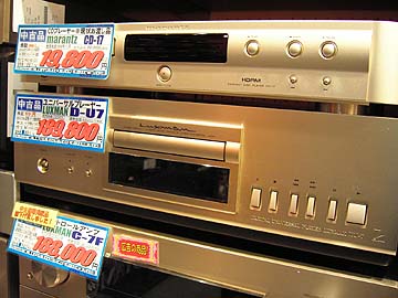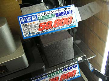 | こちらはオーディオユニオン吉祥寺店。47研究所のD/AコンバーターMODEL4715が中古入荷。11月中旬に入荷し、2週間ほど店頭に並んでいたが、12月初頭に売れてしまった。47LABの製品は人気がある。また、新品販売の値引きはほとんど無い。中古とは言えども、59,800円はとてもお買い得だ。 右上はオーディオユニオン吉祥寺店に並んでいたユニバーサルプレーヤーDU-7。撮影は11月下旬。比較的新しい機種だが、今年夏に生産中止になっている。定価40万円が早くも中古189,800円かー。DVDプレーヤーやユニバーサルプレーヤーの価格はデジカメと一緒で、値下がりが激しい。 |