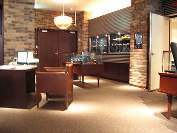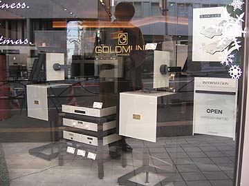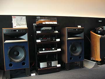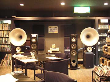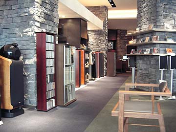 | ガラス越しにゴールドムントのシステムが伺える。なんだかこれは凄そうだぞ。さて、いよいよ店内に入る。まずはフロアの広大さと内装の凄さに唖然とした。こ、これが、オーディオ店か?!まるで、表参道の高級ブランドショップのような内装だ。天井が高く、フロアも広い。柱は石積み風に仕上げてあり、間接照明が店内をほんのりと照らしている。広大なフロアの各所にスポットライトで照らされたオーディオシステムが幾つも佇んでいる。そのどれもがハイエンド機器だ。いずれも試聴可能な状態で配線されている。システム背面を覗くと、ケーブル類はそれなりに良いものを使っていることが確認出来た。全てではないが。オーディオ店では得てして、機器は凄いがケーブルはいい加減ってことが多い。 | ||||||||||||||||||||||||||||||||||||||||||||||||||||||||||||||||