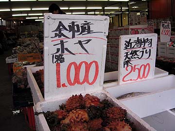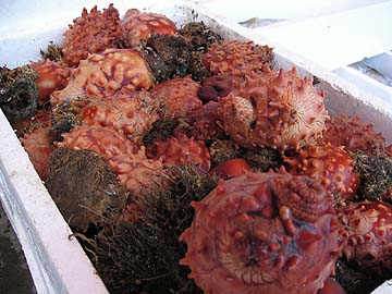| 余市の魚市場で売られていたホヤ。ホヤ自身も、まさか一箱1,000円で売られる事になろうとは、海の中にいる時には想像もつかなかったであろう。とても食い物には見えない様相なのだが、人間って何でも食べてしまうんだなぁ。