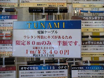 | オヤイデ電気の最新情報。2月27日からTUNAMIの限定特売をおこなっている。3,400円/m(税抜)。外装シースに製造行程で付いた傷がロットが1リール分(80m)あり、傷あり特価販売されているのだ。通常品は実売5,100円/m(税抜)なので、1,700円/mお得。定価換算だと半額ということらしい。傷あり特価品は、外装シースにもろもろとしたスジが入っている。ただ、それほど醜い傷ではない。気になるなら、SFチューブを被せてしまえばいいのだ。 なお、私がこの告知を見つけた時点では、まだ1リールそのまま置いてあった。その後、日を追う毎に売れていき、おととい時点では半分くらいまで減った。口コミで特価販売の話が広がったようだ。この1週間、私はずーっと悩んでいた。ツナミ特価品を何メートル買うべきか。で、金曜日、意を決して10m購入。念願の、TUNAMI屋内配線計画を実行するために。 そんなわけで、残りはさらに減少。あと残り30mを切った。オヤイデの社員さん曰く、たぶん土曜日で売り切れるんじゃないかとのこと。土曜日はオーディオマニアの来店者が多いのだ。なお、ネット上に傷あり特価を掲載すると、あっという間になくなってしまう。この傷あり特価はネット告知はせず、店頭のみの告知となっている。この記事がアップロードされている時にはすでに売り切れになっている可能性が高いが、欲しい方はダメ元でオヤイデ電気に急げ!! |