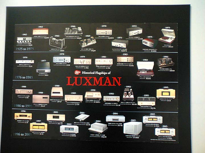 | こちらはオーディオユニオンお茶の水店。階段の壁にLUXMANのポスターが登場。かなり大きなポスターで、迫力十分。ラックスマンの名機が年代順に紹介されている。長年のオーディオファンなら、自分にとって思い出深い機器も載っているのではなかろうか。うーん、このポスターいいなぁ。LUXファンなら、このポスターを部屋に貼りたいところだろう。んでもって、しょっちゅうニヤニヤ眺めているという風景が想像出来る。 | ||||||||||||||||||||||||||||||||||||||||||||||||||||||||||||||||