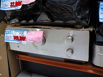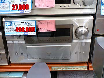 | オーディオユニオン新宿店。デノンの最新最高級マルチチャンネルアンプAVC-A1XVが中古販売されている。定価693,000円。でかい!現行品なので、中古と言えどもあまり値下げ率は良くない。それにしても、このハイエンドAVアンプを買ったオーナーは、金額的にも相当な覚悟で購入したはずだろうが、なぜに手放す気になったのだろう。 右はビクターAX-900。中古価格149,800円はちょっと高め。この機種の中古価格は10万が妥当だ。 AX-900は私もかつて愛用していた1993年発売のプリメインアンプだ。音は非常に良いのだが、お世辞にも人気のある機種ではなかった。現行当時もそれほどの台数売れたわけではないらしいので、中古のタマ数は元々少ない。また、10年超えの選手なので、最近は中古市場でもあまり見かけなくなった。 AX-900は、私が今まで使ってきたアンプの中で、最も私好みの音を奏でてくれるアンプだった。駆動力が高く、全帯域にエネルギーがみなぎる。高域の切れが傑出しており、このアンプならではの音というのが感じられた。ま、私の数少ないアンプ遍歴での感想なので、あしからず。高級機器を嗜んでいるマニアのご烈々には、AX-900みたいな国産中級プリメインなんて鼻にもかからないかもしれん。けど、このアンプ、なかなかやりまっせ。ま、古いので故障が懸念されるけど。 |