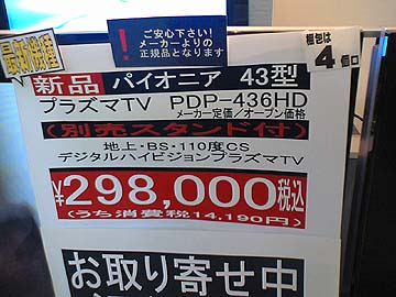 | フジヤエービックの店頭にはパイオニアのプラズマテレビPDP-436HDが陳列されていた。無駄な装飾が一切無いシンプルなデザイン。フルスペック43インチで30万円とは、薄型テレビもずいぶんと安くなったものだ。まぁ、それでも高額であるには違いないが。 | ||||||||||||||||||||||||||||||||||||||||||||||||||||||||||||||||