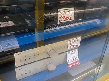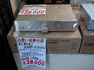 | CECのAMP-3300が4台入荷。ゴールド/ブラック各2台。中古実売29,800円。現行品であり、別に珍しいものではないが、数多く入荷しているので目に留まった。私も幾度か試聴した事がある。ボリュームノブがデザイン的に好みではないが、音のいいプリメインアンプだと思う。LEFというCEC独自の回路構成を採用しており、安価ながらXLR入力にも対応している。この価格なら、2台まとめて購入し、バイアンプ駆動にも容易にチャレンジ出来る。実際、AMP-3300×2台によるバイアンプ駆動を紹介していたオーディオ雑誌があった。右は新品の展示実売例。38,000円。ヒノオーディオサウンドギャラリー店店頭にて。 | ||||||||||||||||||||||||||||||||||||||||||||||||||||||||||||||||