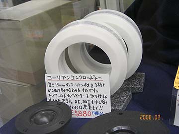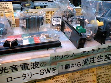 | コイズミ無線では最近、コーリアン材の加工に積極的だ。これはドームツイーター外付け用のコーリアンエンクロージュアなるもの。この加工、専門の業者に委託して、NC切削マシンにて高精度加工しているらしい。NCマシンなのでかなり複雑な加工にも応じてくれる。寸法なども自由にやってくれる。フロントバッフルなどの大型の工作にも応じてくれるらしい。自分だけのオリジナルコーリアンパーツかぁ、コンデンサー固定アダプターなんか作ってもらったら面白そうだなぁ。 右は秋葉原ラジオセンター内のパーツ店で東京光音のスライドボリュームが多数展示販売されていた。店名は忘れた。小沼無線やアムトランスの筋の店だ。いままで気づかなかったなぁ。東京光音のスライドボリュームは原田加工所のVF-203にも用いられている高性能フェーダー。これでいつか、自作パッシブアッテネーターを自作したいと思っている。 |