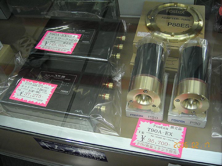 | ラジオ会館のキムラ無線。限定ユニットT90A-EXと専用ネットワークボックスNW-90が陳列されていた。これは2月17日の模様。T90A-EXはNW-90とのセット販売のみということで、数セット在庫しておられた。その後売れてしまったので現在は店頭から消えている。今月再入荷するらしい。ユニット本体より、ネットワークの方が高い。セット揃えると14万弱か。ふーむ。 | ||||||||||||||||||||||||||||||||||||||||||||||||||||||||||||||||