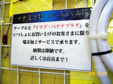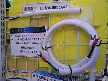 | オヤイデ電気。店の奥に極太のVCT線が転がっていた。直径はなんとφ22!5.5スケアが8芯も束ねられている。うわー、なんじゃこれ。これ小売りしてくれるんですかと聞いたら、電気工事関係業者から注文を受けて特別に取り寄せたモノで、小売りはしないとのこと。コンセント4個搭載の電源タップにこのケーブルを使えば、プラグからの4系統同一パラレル配線が実現出来るんだがなぁ。プラグ側の端末処理がとてつもなく大変そうだが。 | ||||||||||||||||||||||||||||||||||||||||||||||||||||||||||||||||