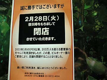 | 中央通り大交差点角の喫煙所SMORKERS STYLEが閉店することになった。開設されてより3年も経ったかぁ。そう、この喫煙所が出来た当初、秋葉原を含めた千代田区にて、路上喫煙禁止条例が施行された。全国に先駆けたこの条例、効果は絶大で、秋葉原でのタバコのポイ捨てが激減。代わりに喫煙スポットを設けてほしいという喫煙者の要望に応えて設置されたのが、SMORKERS STYLEだった。名残惜しいなぁ。 | ||||||||||||||||||||||||||||||||||||||||||||||||||||||||||||||||
