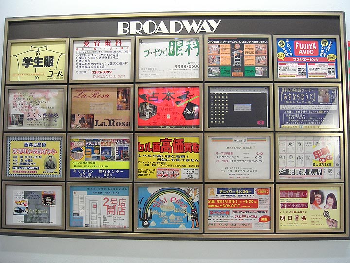 | 中野ブロードウェイ階段に掲げられている3階のテナント一覧。フジヤエービックの入居している中野ブロードウェイは知る人ぞ知るマニアック専門店街なのだ。占い、オカルト書籍店、アンティークおもちゃ専門店、マニアック中古CD店、マンガ原稿専門店、セル画専門店、食玩専門店、映画ポスター専門店、アダルトショップ、アイドルブロマイド専門店、中古雑誌専門店。そして、古本マンガ書店の大御所「まんだらけ」の総本山でもある。 | ||||||||||||||||||||||||||||||||||||||||||||||||||||||||||||||||