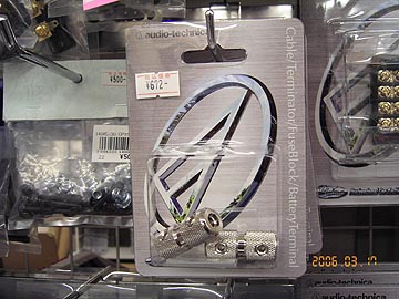 | こちらオーディオテクニカのケーブルジョイントアダプターTCT-8。現在発刊中のオーディオアクセサリ−120号の連載記事、旬の音本舗福田屋274ページで紹介されているやつだ。福田先生はこのカーオーディオ用アーシングパーツを、ピュアオーディオのバイワイヤアダプターとして応用されたのだ。この記事を読んで、私も早速TCT-8を探した。秋葉原のラジオ会館4階インパルスで発見。購入した。ただ、このパーツは前述の通りカーオーディオ用品である。この記事を読んだオーディオマニアはきっとTCT-8を探しているはずである。そこで、コイズミ無線で扱ってもらうよう小泉常務に頼んだ。コイズミ無線は従来から、オーディオテクニカのカーオーディオパーツを扱っているので、すぐに取り寄せられるとのこと。さすがは小泉常務、TCT-8を早速、店頭販売品に加えてくださった。TCT-8が2個入りで定価840円。コイズミ無線実売672円。TCT-8のバイワイヤケーブルへの利用方法や、温室効果についての詳細は、現在発売中のオーディオアクセサリ−120号をご覧あれ。なお、TCT-8を含めたオーディオテクニカのアーシングパーツは皆、輝かしい銀色のメッキ処理がなされており、同社のカタログにはプラチナカラー仕上げと明記されている。ただ、本当にプラチナメッキなのか、ちょっと疑問。本当にプラチナメッキなら、プラチナメッキと明記するはずだからだ。ま、ピュアオーディオに用いても音質はすこぶる良好らしいので、良しとしよう。私もこういう中継パーツを探していたところだったので、TCT-8を見出された福田先生に感謝である。 | ||||||||||||||||||||||||||||||||||||||||||||||||||||||||||||||||