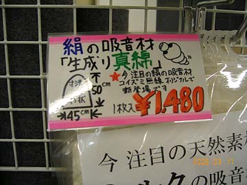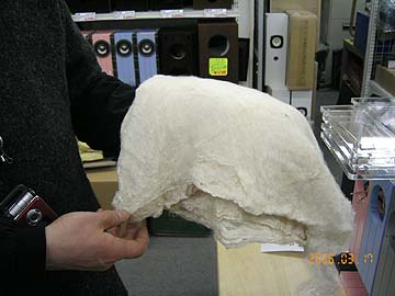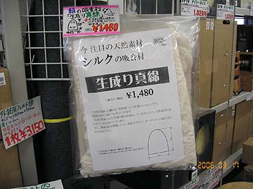 | これもその一つ。シルク吸音材。今までは一部のマニアが、自作ケーブルの絶縁材や、ルームアコースティック用に用いてきたシルク素材。ところが、アコースティックリバイブが一昨年、ピュアシルクアブソーバーPSA-100を発売。これはかなりのヒット商品となった。それ以降、オーディオ界での認知度が一挙に高まった感のあるシルク。ただ、PSA-100は実売5,000円/100gと高価。オーディオアクセサリーとして流通する以上、高価になるのは仕方ない。業界には暗黙の価格体系があるのだ。これはPSA-100に限った事ではない。例えば私が愛用しているポリマールと言う金属磨き布。1枚250円である。これがオーディオ用研磨布としてパッケージングされ、某オーディオアクセサリー店に並んだら、価格は10倍。波動が入っているとかなんとかで、純粋には同じものではないのかもしれないが。