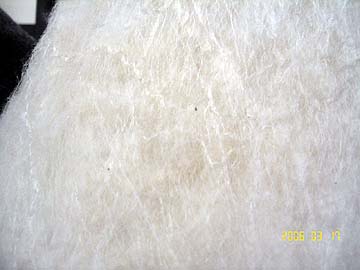 | 生成り真綿はシート状になっている。約45cm×50cmほどのシート状。厳密に言うと、袋状をしている。このシート、お蚕さん何匹分なのだろうか。そう思うと、大切に使わなきゃなぁという気になる。