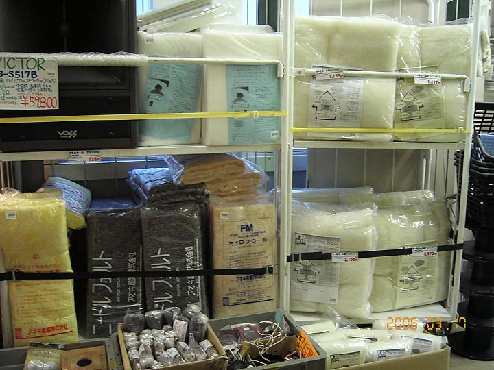 | コイズミ無線本店入り口にある吸音材コーナー。右はサーモウール。羊の毛だ。本来は、シックハウス対策用の家屋用断熱材として使用されているのだが、エンクロージュア用吸音材や、オーディオルームの定在波対策として利用されている。真ん中の上は、東京防音のホワイトキューオン。ポリエステル繊維吸音材だ。ペットボトルを原料にしたリサイクル品である。真ん中の下のピンク色のは、アオキ産業のミクロンウール。基本的にはグラスウールなのだが、繊維が柔らかく、グラスウールのようにチクチク手に刺さる事は無い。灰色のものはアオキ産業のニードルフェルト。主原料は古着。左の黄色いのは、お馴染みのグラスウール。これら吸音材、どれが良い悪いというわけではな。それぞれに特色がある。自分の目的とする用途には何が向いているかは、店員さんに相談してみてね。 | ||||||||||||||||||||||||||||||||||||||||||||||||||||||||||||||||