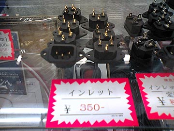 | キムラ無線。珍品や限定品が入れ替わり立ち代わり入荷しているのだが、全てを紹介するわけにはいかない。左は最近入荷したACインレット。フルテックのものに極めて良く似ているが、フルテック製ではない。金メッキでノーブランド。刻印からするとイナルウェイ製と思われるが、確証はない。