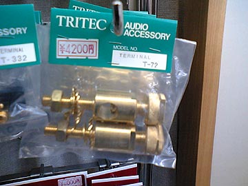 右はトリテックの巨大スピーカーターミナルT-72。真鍮製。写真では大きさが分りにくいが、とにかくでかい。T-72はキムラ無線とコイズミ無線で扱っていたが、ここ1年以上在庫切れのままだった。久々の入荷である。Yラグ対応、バナナ非対応。 まだまだあるのだが、長くなるので今日はこのへんで。続きはまた今度。 |