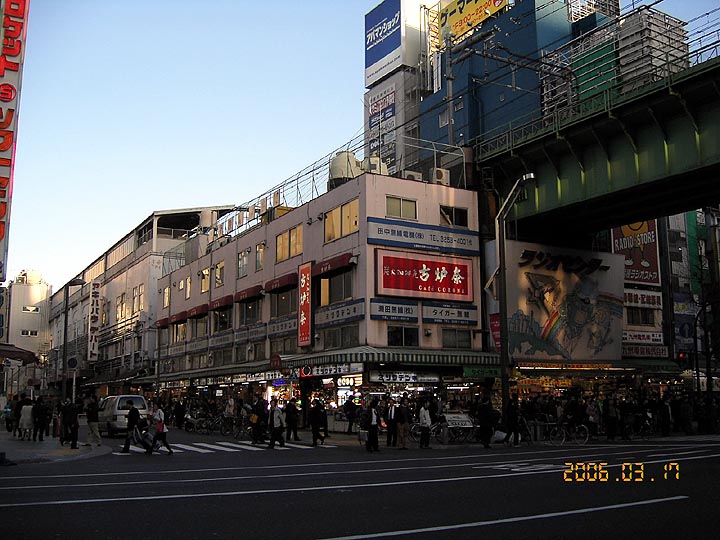| ラジオストア側から秋葉原西口交差点を望む。真上に総武線の高架が通っている。対面には、東京ラジオデパートやオヤイデ電気の看板が見える。秋葉原で最も人通りの多い界隈だ。電気街方面とは反対側にヨドバシカメラが出来ても、電気街方面の人通りは相変わらず。むしろ、数年前より人通りが多くなったように思う。 | ||||||||||||||||||||||||||||||||||||||||||||||||||||||||||||||||
