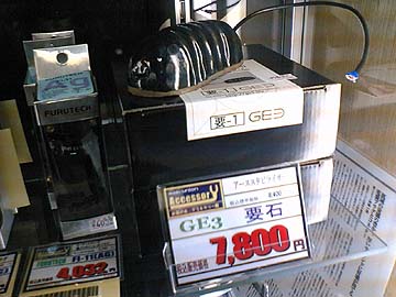 右はGe3の要石(かなめいし)。世にも珍しい仮想アース装置だ。電源は必要なく、本体から延びているリード線をオーディオ機器の筐体にネジ留めしてやれば良い。私は使った事が無いので効果のほどは不明だが、Ge3のアイテム中でもかなりの人気を誇る。ということは、それなりの効果があるという事か。S/N感が向上したり、音像定位が改善されたりするという話を聞く。オーディオユニオンでも度重なる問い合わせがあったようで、数ヶ月前に店頭に並んだ。同店の他にも、多数のオーディオ店で見かける事が出来る。陶器製と思われる本体ケースの内部は不明。どういう仕組みで機器のアース電位を低下させるのか。なお、現行の要石は2世代目にあたり、初代要石は不格好なコンクリートの塊みたいな姿をしていた。私は以前、アコースティックリバイブのスーパーアースリンクRE-9というアース電位低下装置を使っていた事がある。RE-9はAC電源が必要で、機器のシャーシ電位を電気的な処理で安定化させるというものだった。ただ、このRE-9、使い方を誤ると感電したり、ブレーカーが落ちてしまったりした。トラブルが連発したからか、RE-9はRE-9Mk2に進化した後、絶版になってしまった。それを思うと、要石は電源を必要としないので感電の危険性はないはずだ。 |