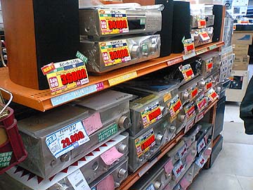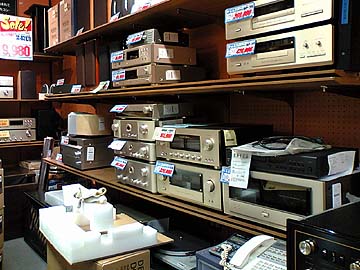 | こちらはオーディオユニオン吉祥寺店。同店もPSE騒動の影響と思われる在庫減少が見受けられる。普段はフルサイズ機器で埋め尽くされている陳列棚が、小型スピーカーで穴埋めされていた。PSE騒動は中古オーディオ店にとって災難には違いなかったが、PSE特需とでも言うべき現象を生じせしめた。 | ||||||||||||||||||||||||||||||||||||||||||||||||||||||||||||||||