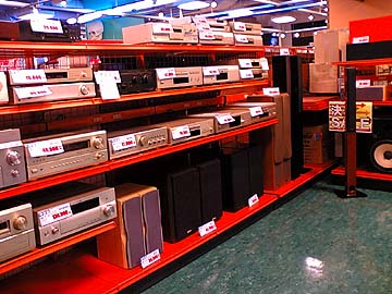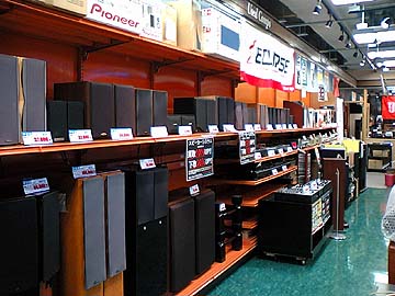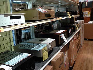 | 1階セカンドハンズのオーディオ機器類展示棚の一部。中古機器類がずいぶんと少なくなった。PSE騒動に踊らされた消費者が買いに走ったためと思われる。空いた棚を埋めるべく、小型スピーカーが陳列されている。 | ||||||||||||||||||||||||||||||||||||||||||||||||||||||||||||||||