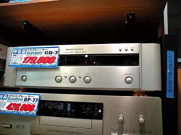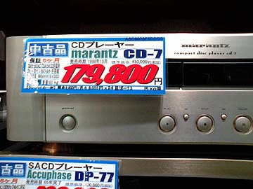 | オーディオユニオン吉祥寺店。マランツの最上級CDプレーヤーCD-7。1998年製で、当時の定価は45万円。中古実売179,800円。先月入荷して後、すぐに店頭から姿を消したのだが、なぜか再度店頭復活。新たな機体か、それとも購入キャンセルがあったのか。いずれにしても、中古出物が滅多に無い稀少機器であり、しかもこの価格なら即買いだ。1998年と言えば、TEACからVRDS-25xs、ビクターからはCD-XP999EXが登場。そしてこのCD-7。これら名機と言われるCDプレーヤーが一斉に登場した時期であり、一体型CDプレーヤーが成熟期を迎えた年と言えるだろう。次年度よりSACDが登場するのであるが。 | ||||||||||||||||||||||||||||||||||||||||||||||||||||||||||||||||