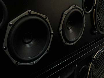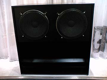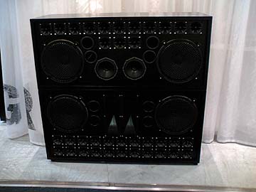 | 左写真のバックロードスピーカーには、38cmクラスのウーハーとおぼしきユニットが2発搭載されている。フォステクス製と思われるが、はっきりと断定出来ない。私の胸丈ほどの高さなので、たぶん120cm程度の高さはあるだろう。かなりでかい。右は多数のユニットが配置されたバスレフスピーカー。上下2段が積み重ねられている。姿形からして、PA用途のスピーカーである。私はPA製品の知識を持ち合わせていないので、これが既製品なのか、なんなのかさっぱりわからない。ただ、スピーカーボックスの造りを見てみると、量産品と言う雰囲気ではない。自作品、もしくは、PA専門店の特注品と推察される。 | ||||||||||||||||||||||||||||||||||||||||||||||||||||||||||||||||