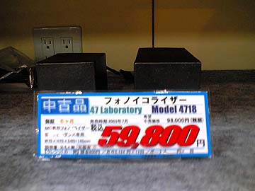 | オーディオユニオンお茶の水店1階。昨日の巡礼記で紹介し忘れたので掲載。47研究所のフォノイコライザーModel4718が入荷。定価98,000円が中古59,800円。新品実売の値引きがほとんどないブランドであるし、中古でも滅多に見かけない製品。これはお買い得。ちなみに、私も4718を使っている。ただし、この4718、背面のロット番号を確認すると、ローインピーダンスカートリッジ向きの個体と判明。オルトフォンなどのローインピーダンスカートリッジには向くが、オーディオテクニカ系のハイインピーダンスカートリッジには向かない。